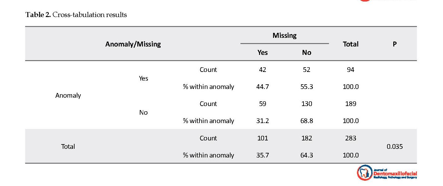 The results of this study showed a significant statistical difference between the groups with and without tooth regarding agenesis (P=0.035) (Table 2). In the group with tooth agenesis, the prevalence of another dental anomaly was lower (P=0.026) with the OR of 1.78. However, there was a higher rate of dental anomalies in the control group.