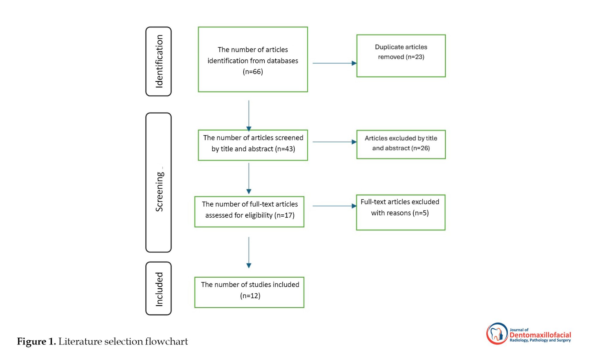 Sixty-six articles were initially identified from various databases. After removing 23 duplicate articles, 43 unique articles remained and were screened by title and abstract. Of these, 26 were excluded, leaving 17 full-text articles to be assessed for eligibility. Ultimately, 5 full-text articles were excluded because they either didn’t focus on formal or academic dental examinations or lacked clear performance metrics or qualitative findings, resulting in a final total of 12 studies included in the analysis (Table 1).