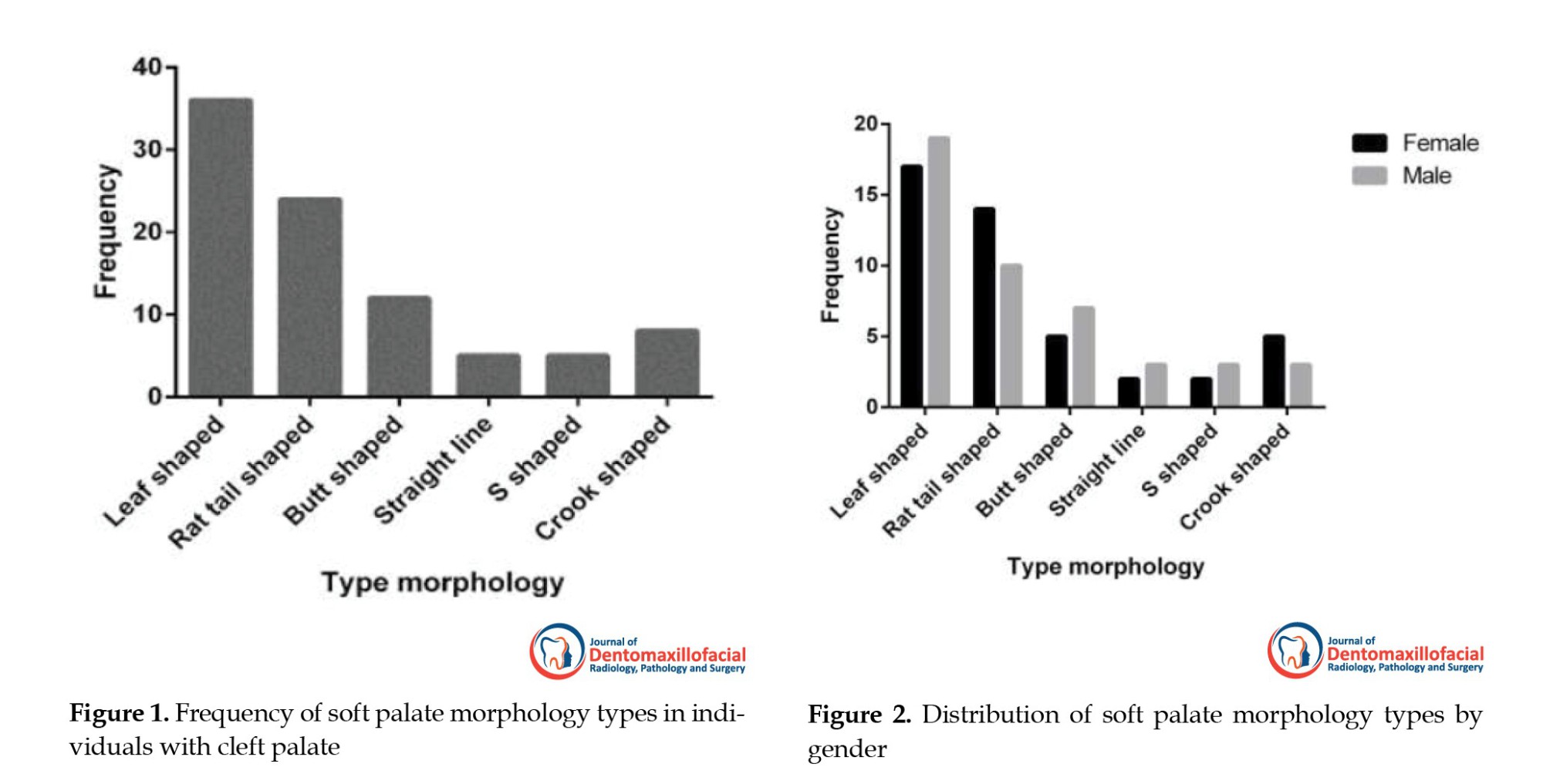 Figure 1 represents the frequency distribution of different soft palate morphology types, based on You et al. (15) classification system among individuals with cleft palate who attended dental schools at Guilan University of Medical Sciences. The results indicate that the leaf-shaped type had the highest frequency, with 36 cases (40%), while the straight-line and s-shaped had the lowest frequency, with 5 cases (5.6%). Figure 2 illustrates the distribution of morphology types by gender, showing similar patterns in males and females, with no remarkable differences.