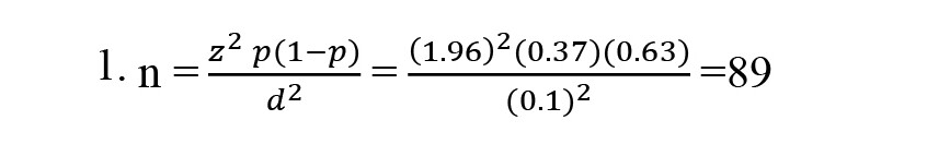 The required sample size was calculated to be n=89 based on a single proportion formula (Equation 1), assuming a 95% confidence level, 80% power, and an anticipated prevalence of 50% with a precision of 10%. To compensate for possible dropouts and missing data, the sample size was increased to 90 participants (23).