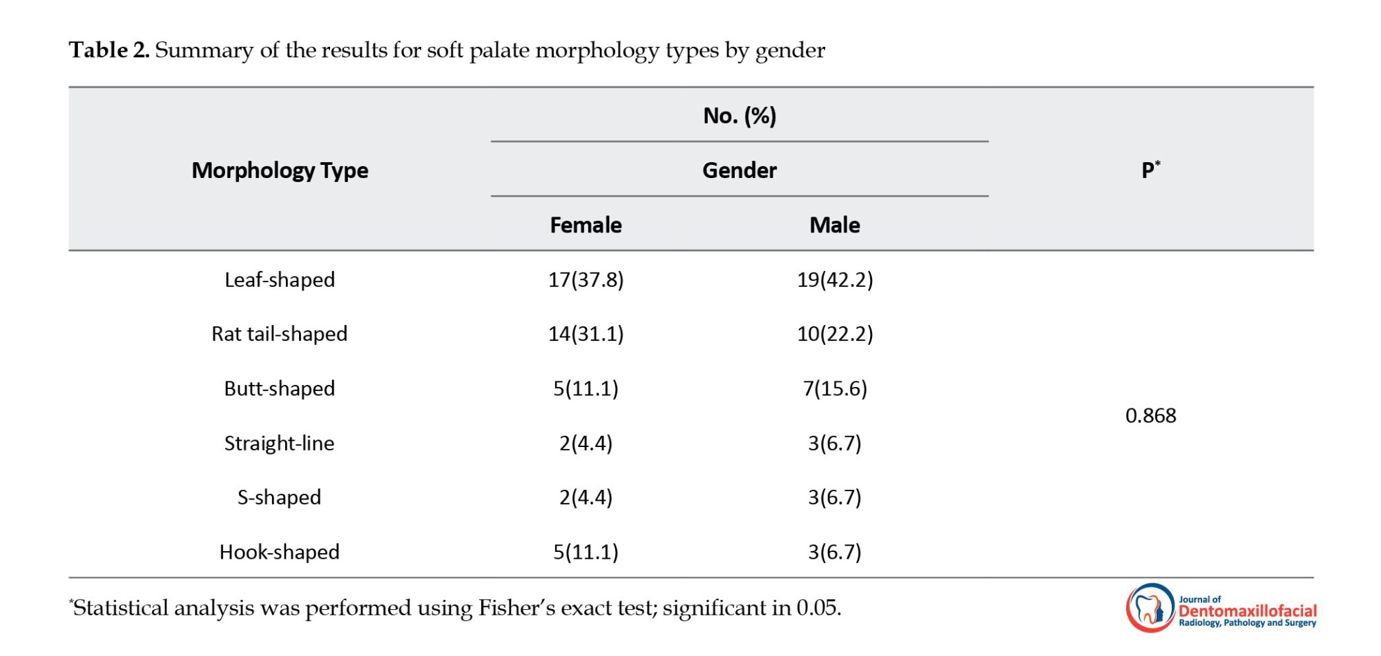 The inter-rater and intra-rater reliability for soft palate morphology classification were assessed using Cohen’s kappa coefficient, with values indicating excellent agreement. Cohen’s kappa was calculated by comparing the observed agreement between raters to the expected agreement by chance, expressed with a 95% confidence interval (CI). Values above 0.80 were interpreted as near-perfect agreement. Any classification disagreements were resolved through consensus discussions and joint image review to ensure consistent and reliable interpretation. This rigorous reliability assessment supports the robustness of the morphological data reported in this study. The descriptive analyses employed mean, frequency percentage, standard deviation, minimum, and maximum values. Statistical analysis was performed using Fisher’s exact test. Data processing was executed via SPSS software, version 19 and statistical significance was considered at 0.05.