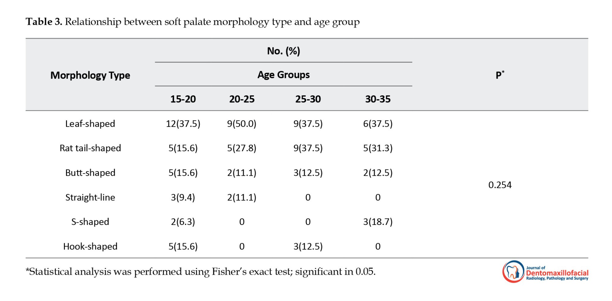 To analyze the relationship between morphology type and patient age group, Fisher’s exact test was used, and the results are presented in Table 3.